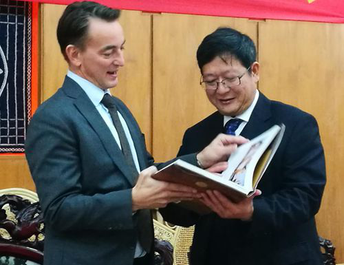 2017年12月5日下午,美國(guó)新(xīn)任成都總領事林傑偉一行到雲南民(mín)族博物(wù)館參觀。在高力青館長(cháng)陪同下,總領事參觀了《民(mín)族服裝(zhuāng)服飾與制作(zuò)技(jì )藝》《民(mín)族文(wén)字古籍》陳列展覽,對雲南民(mín)族服裝(zhuāng)服飾充滿興趣,為(wèi)雲南民(mín)族文(wén)字古籍博大精(jīng)深吸引,連連稱贊,還與館領導和本館學(xué)者交流了少數民(mín)族文(wén)化保護情況。