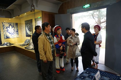 2018年4月28日,“藍白之上  三春錦繡——白族紮染傳統工(gōng)藝搶救保護與傳承創新(xīn)展”在我館展出。本次展覽由雲南省民(mín)族宗教委少數民(mín)族傳統文(wén)化搶救保護資助項目提供支持,雲南民(mín)族博物(wù)館主辦(bàn),大理(lǐ)州非物(wù)質(zhì)文(wén)化遺産(chǎn)保護中(zhōng)心、大理(lǐ)璞真白族紮染博物(wù)館協辦(bàn)。雲南省民(mín)族宗教委副主任李正洪、文(wén)宣處處長(cháng)沙雲生、雲南省博物(wù)館副館長(cháng)譚粵紅、大理(lǐ)州非遺中(zhōng)心代表杜漪、白族紮染技(jì )藝國(guó)家級傳承人段銀開、雲南民(mín)族博物(wù)館館長(cháng)高力青、副館長(cháng)楊松海、辦(bàn)公(gōng)室主任王國(guó)梁、科(kē)研部副主任楊曉、境界傳媒有(yǒu)限公(gōng)司總經理(lǐ)黎春、民(mín)博各部門負責人和職工(gōng)代表出席了展覽啓動儀式。